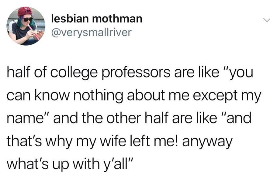 There were two professors like this in my department and I was one of like 20 people who was taught by both of them so there was a very small gang of us who knew that Professor Brick Wall and Professor Overshare were married with two kids.