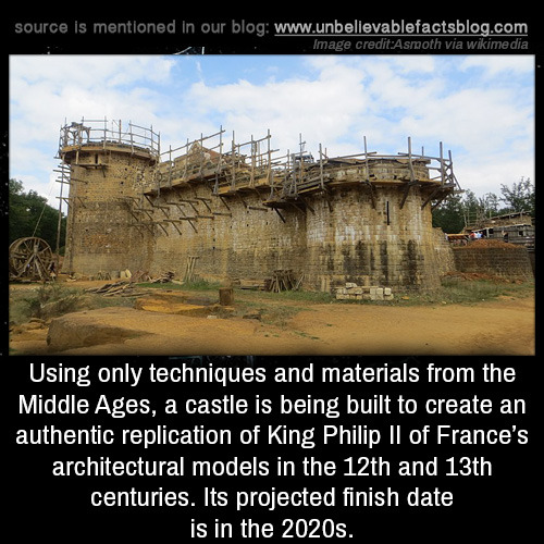 Using only techniques and materials from the Middle Ages, a castle is being built to create an authentic replication of King Philip II of France’s architectural models in the 12th and 13th centuries. Its projected finish date is in the 2020s.