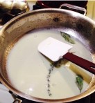 - Add a little boiling pasta water to a saute pan over low heat, and whisk/mix in the butter quickly till it’s creamy and emulsified. If it’s too thick, just whisk in a teeny bit of pasta water. Add 2 bay leaves and a sprig of thyme for aroma, remove when pasta’s ready.