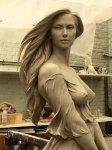 And here she and the statue are in a more formal setting (museum or art show, I can’t tell):