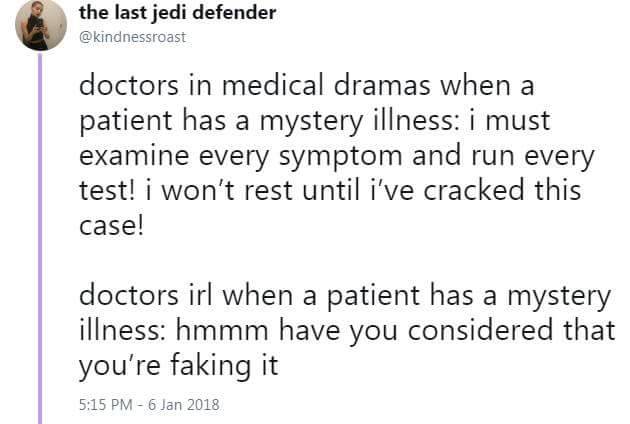 Clueless doctors are global. I strained my back spectacularly when I was 15, it didn’t heal for something like a month. My GP, who I’ve seen since I could remember, had me sent for an X ray to check for a slipped disc (got that part right). When the results came back normal – he did absolutely fucking nothing. Not even a token offer of painkillers or sending me to a chiropractor to sort out. Absolutely-bloody-nothing.