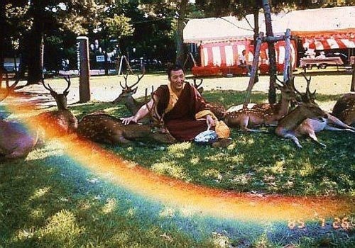 A Tibetan Monk blesses the deer that gather around him and someone snaps a picture. Upon viewing the picture they notice a rainbow had appeared.