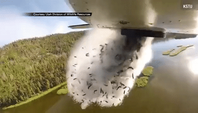 If you’ve ever wondered how lakes are stocked with fish, here it is! Thousands of native fish are being dropped from an airplane. Video is from the Utah Division of Wildlife Resources.