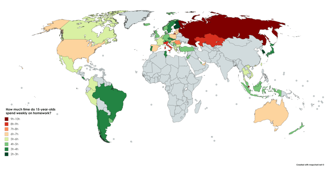 How much time do 15-year-olds spend weekly on homework?