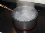 A rock crystal vessel with faceted sidewall, chamfered shoulder, conical finial, two lateral right-angled handles; circular rim with applied gold sheath. 138 grams, 82mm (3 ¼")