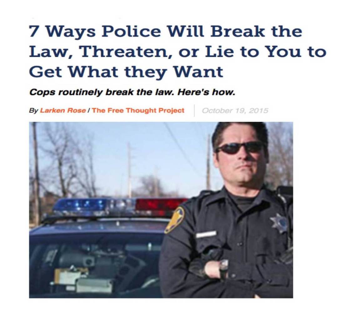 Because of the Fifth Amendment, no one in the U.S. may legally be forced to testify against himself, and because of the Fourth Amendment, no one’s records or belongings may legally be searched or seized without just cause. However, American police are trained to use methods of deception, intimidation and manipulation to circumvent these restrictions. In other words, cops routinely break the law—in letter and in spirit—in the name of enforcing the law. Several examples of this are widely known, if not widely understood.