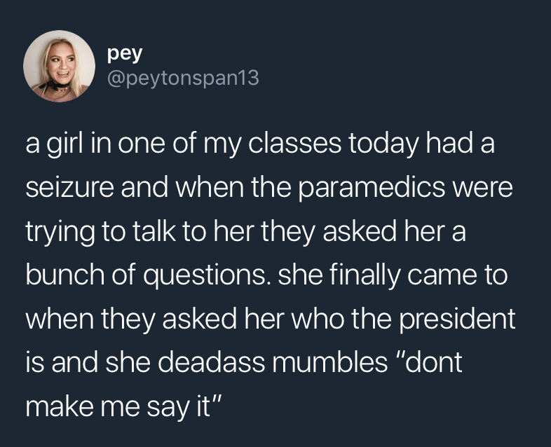 My roommate is a neurologist and has to do this check all the time. Her all-time favorite so far has been “ay dios mio” during which the woman was vigorously crossing herself.