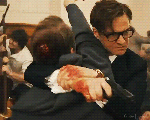 For starters Eggsy was there, tied to the chair and with a bruised eye, but otherwise looking fine. And, instead of finding the bald man or another random chick or asshat fucking Harry, they found Harry beating the living shit out of a good fifteen different people.