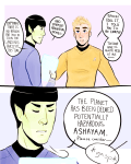 “A human,” Sarek said once again, standing in the center of Spock’s quarters after seemingly not hearing Spock’s request that he sit. It was illogical to repeat the words, as they had at this point established that yes, Spock was in love with a human. Was, in fact, already mentally bonded to said human. He had been worried when his parents boarded the Enterprise that they may discover the relationship that had bloomed between he and Jim, but he had hoped with all the excitement of assassination attempts and Sarek’s own brush with death, they may have been distracted enough not to notice anything odd. Unfortunately, he underestimated his parents’ powers of observation.