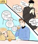 prompt from @lenyberry: for some reason, someone gives Spock an herbal tea blend designed for helping humans get to sleep. But everyone failed to consider differences of vulcan biology & check the ingredients – and while catnip is a very mild sedative with no further psychoactive effects for humans, vulcans evolved from a more felinoid ancestry… No lasting harm done of course, just, catnip tea + insomniac vulcan = Extra Cuddly *stoned* vulcan who’s probably not gonna sleep til he comes off the high.