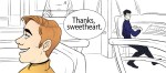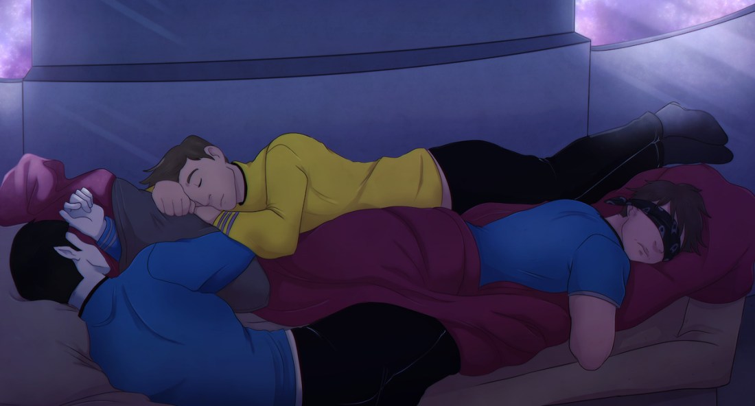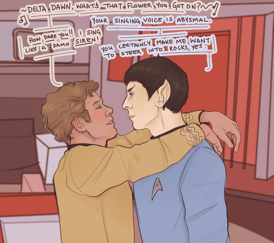In response, Jim sticks his tongue out at him. It’s at this moment the sickbay doors decide to swish open, revealing Spock. Jim immediately straightens and his face straightens into an uncontrollably bright smile. “Spock!”